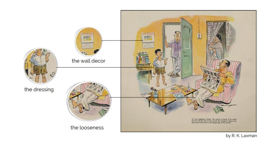 used by Mario Miranda is more of closed and tight forms which give a touch of sophistication. On the other hand, loose andfree flowing lines can be seen in R. K. Laxman’s work. Although both the artists worked in the same city in the same era with a relatively similar style, yet their works differ largely. The way they perceived people, environments around them and what they saw differed according to their cultural differences.
