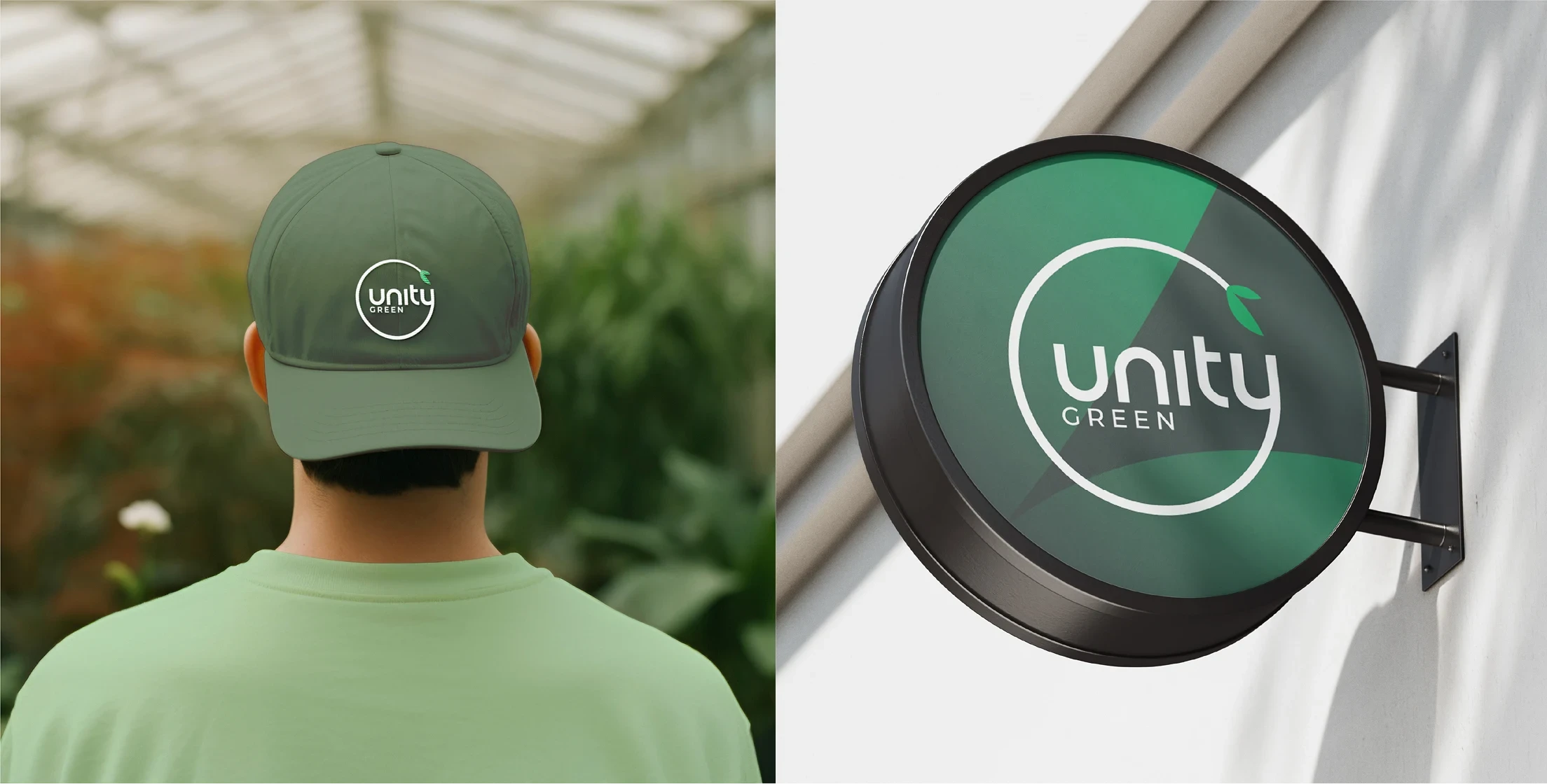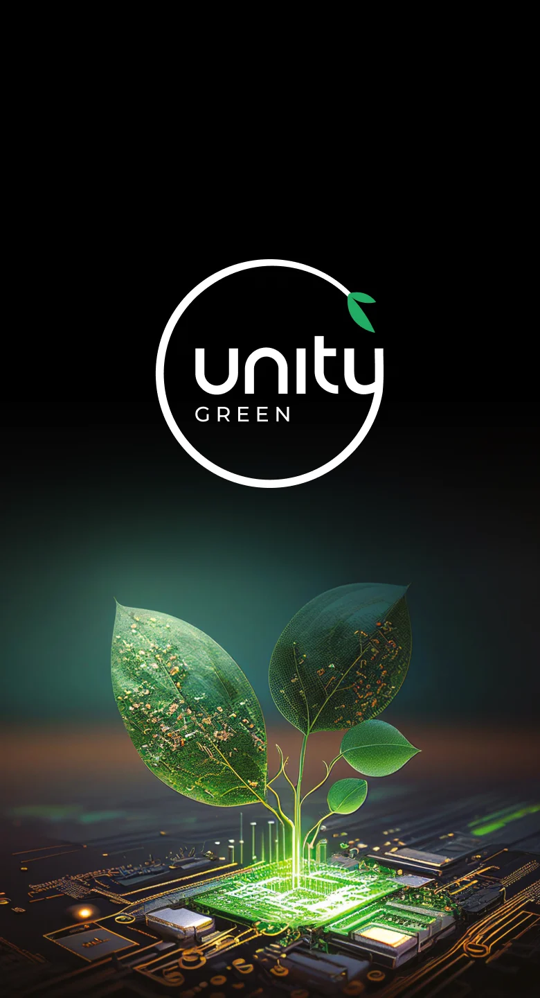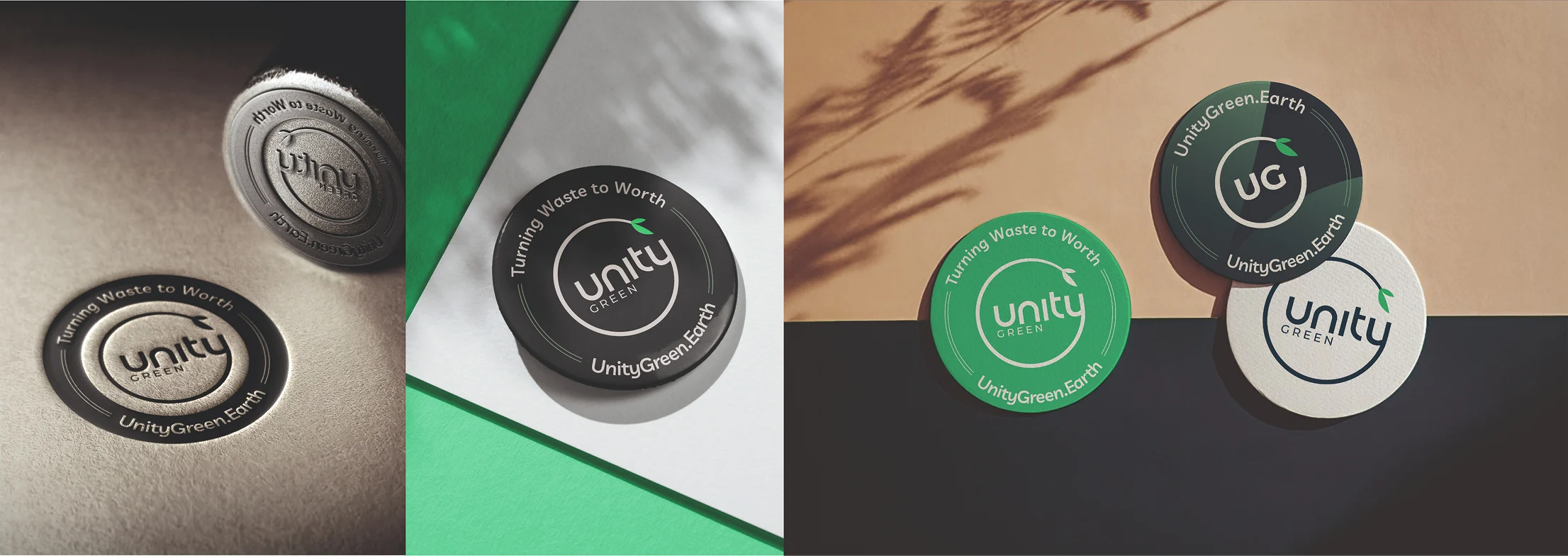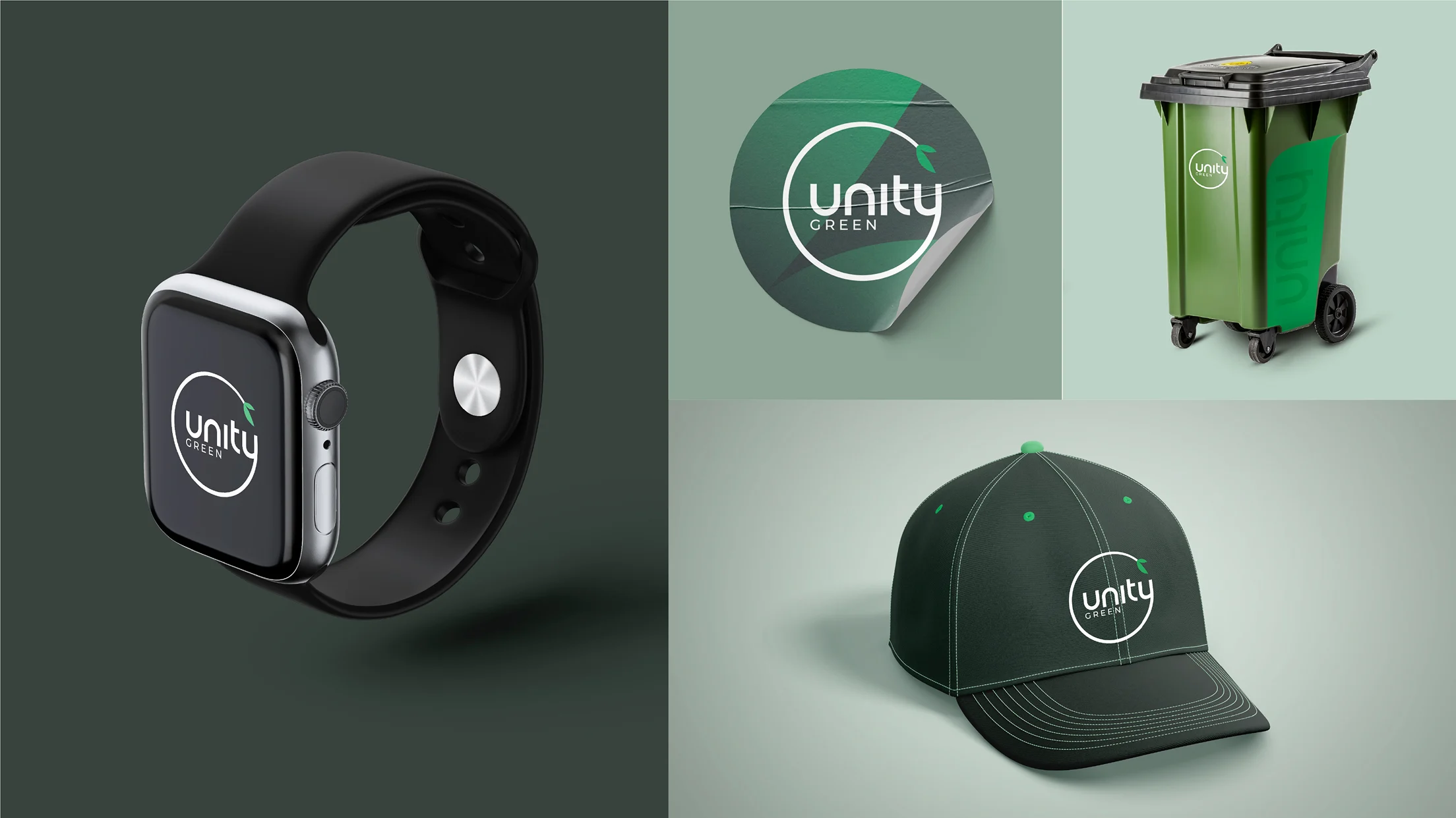 The visual language of Unity Green blends organic green forms with structured layouts, reflecting the harmony between nature and technology. Circular motifs and flowing shapes reinforce continuity and transformation, while deep tones and clean compositions add a modern, progressive feel. Overall, the system positions the brand as a tech-driven sustainability leader with a clear, purposeful identity.