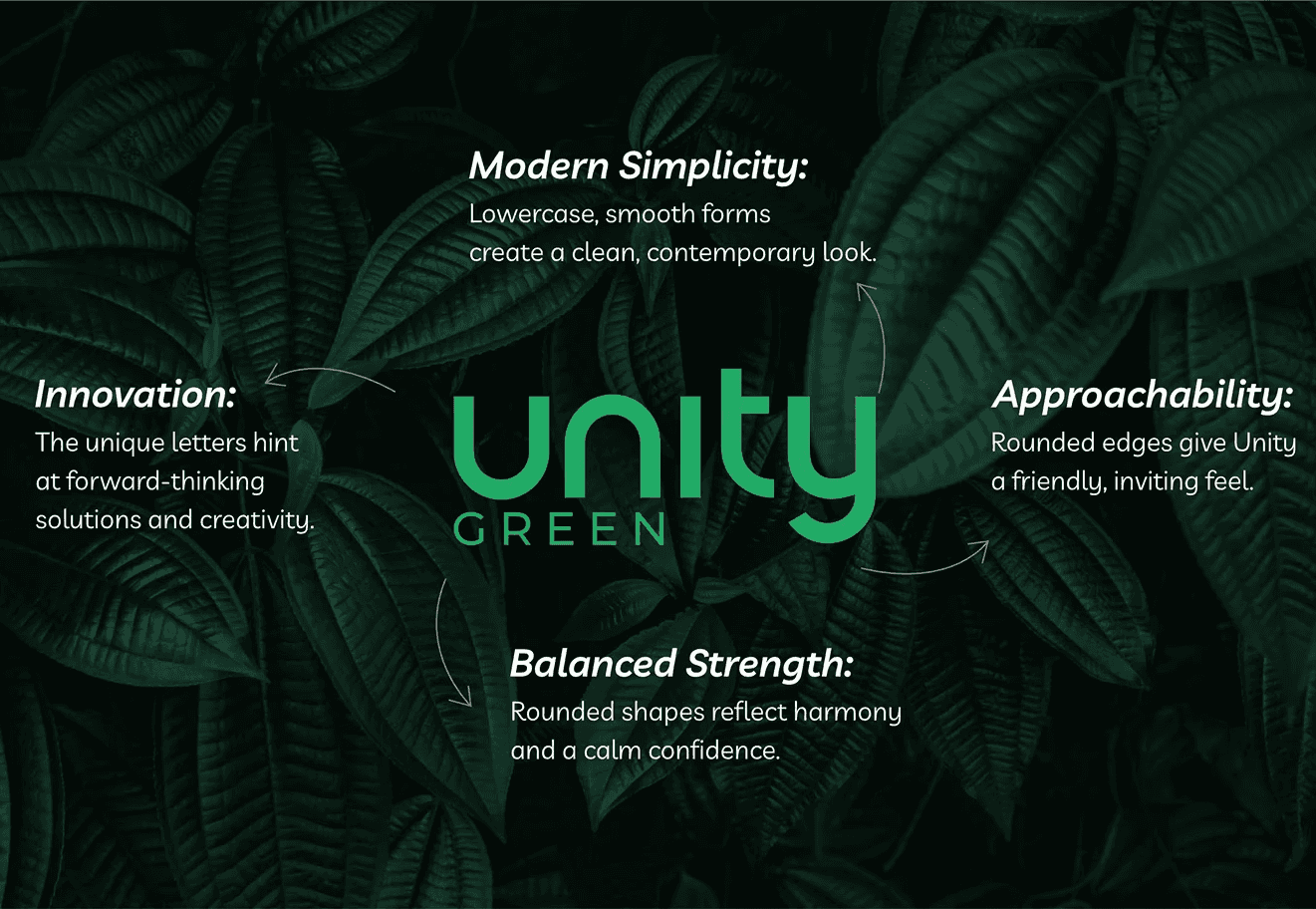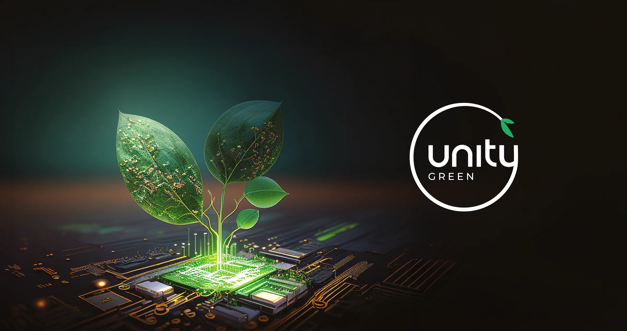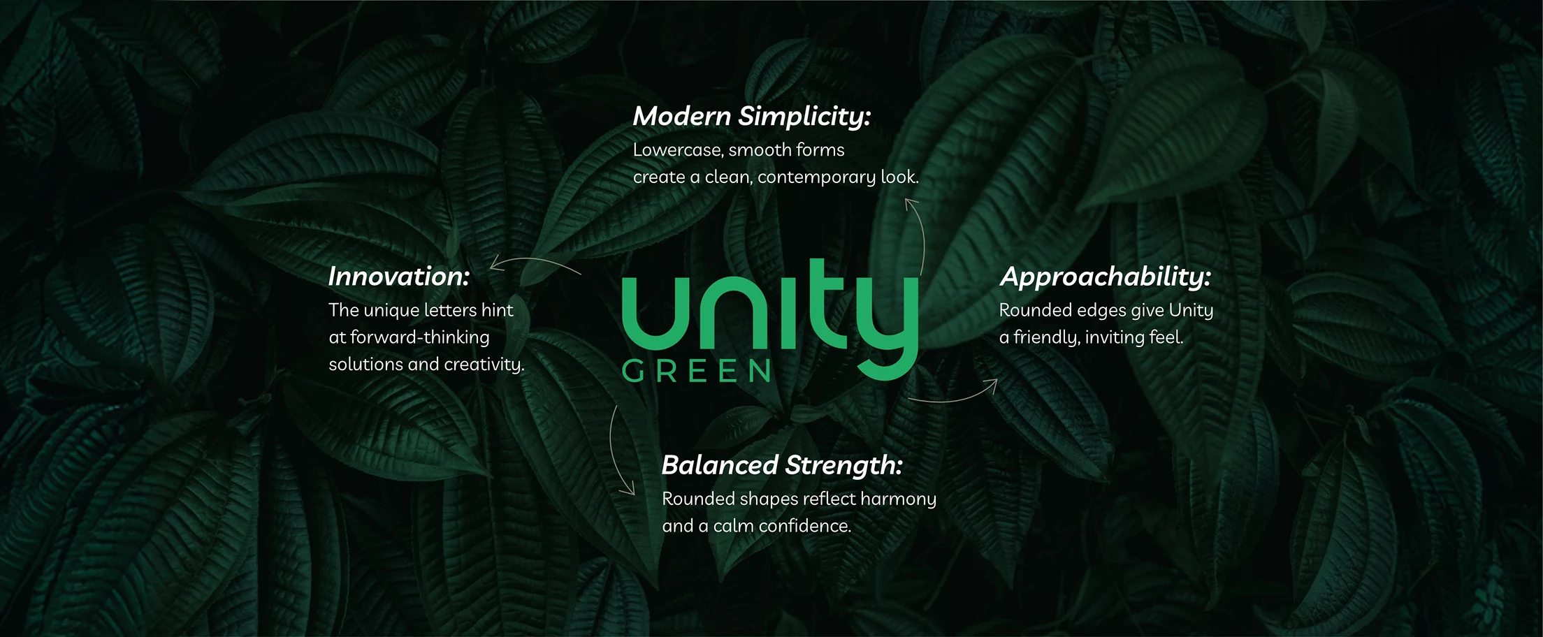 The visual language of Unity Green blends organic green forms with structured layouts, reflecting the harmony between nature and technology. Circular motifs and flowing shapes reinforce continuity and transformation, while deep tones and clean compositions add a modern, progressive feel. Overall, the system positions the brand as a tech-driven sustainability leader with a clear, purposeful identity.