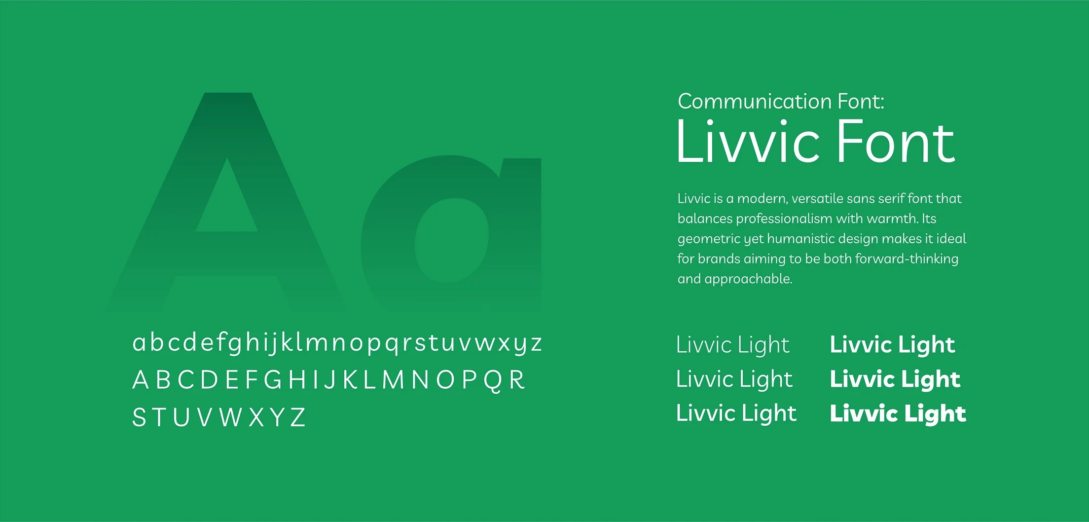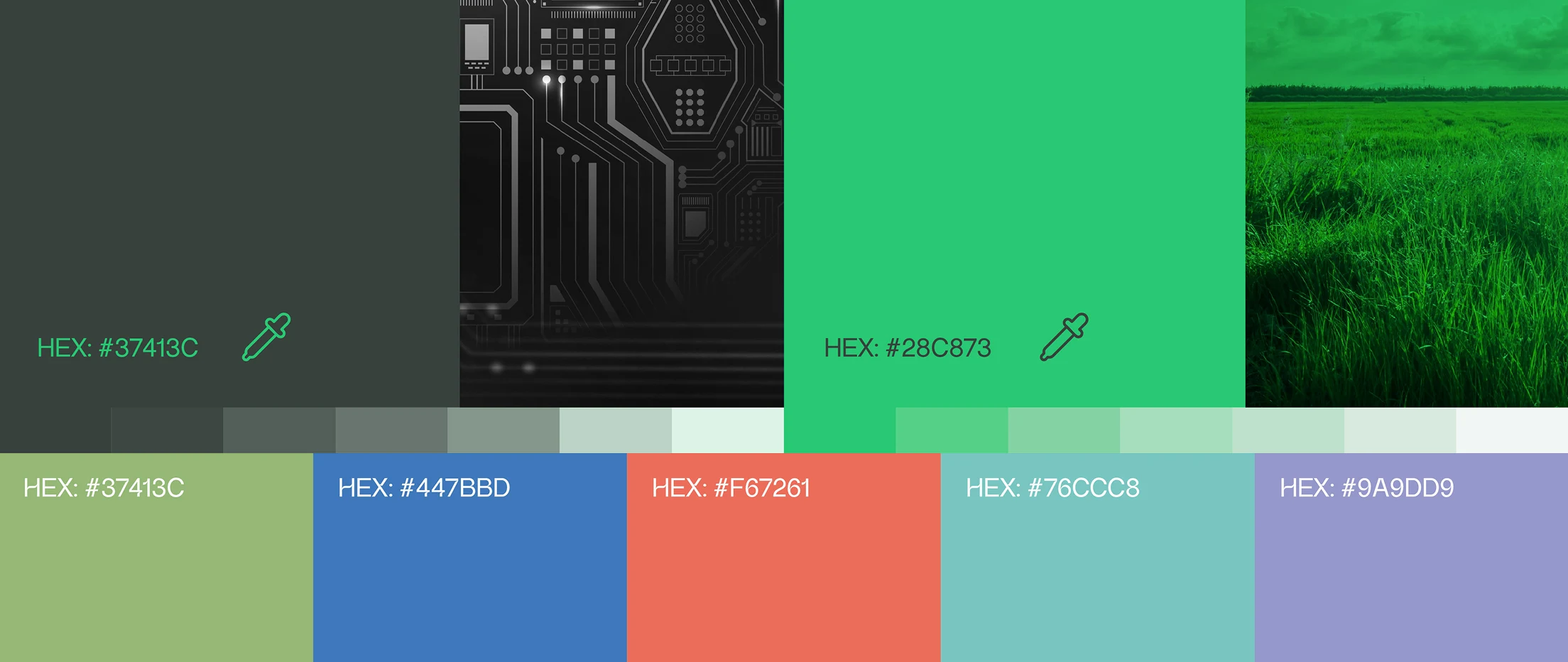 The palette balances nature and technology. The primary greens represent sustainability, growth, and trust—forming the core of the brand.