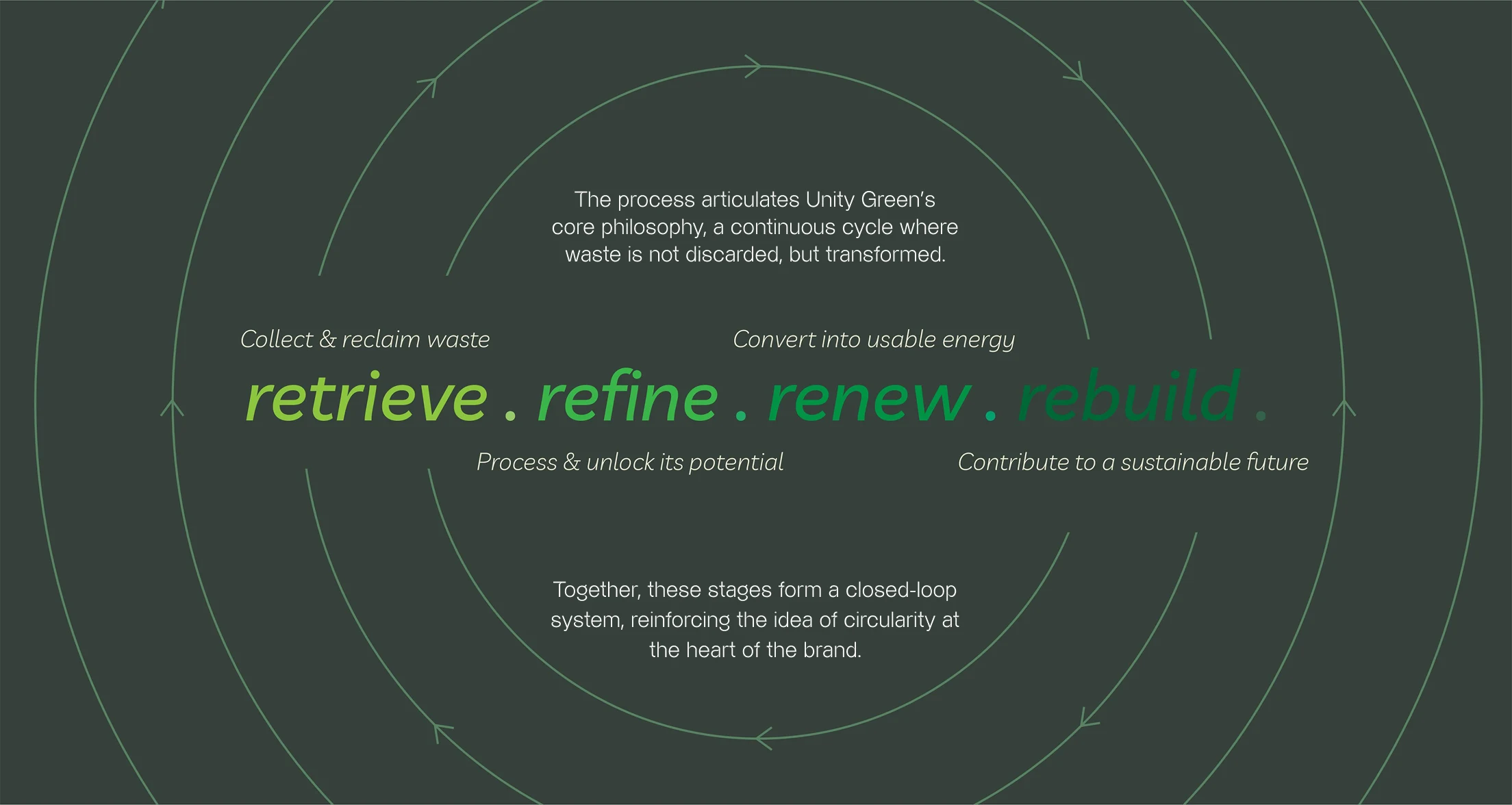 Every output becomes an input. Every stage feeds the next. The brand needed to make this invisible truth visible & position Unity Green as the architects of that loop, not just a link in it.