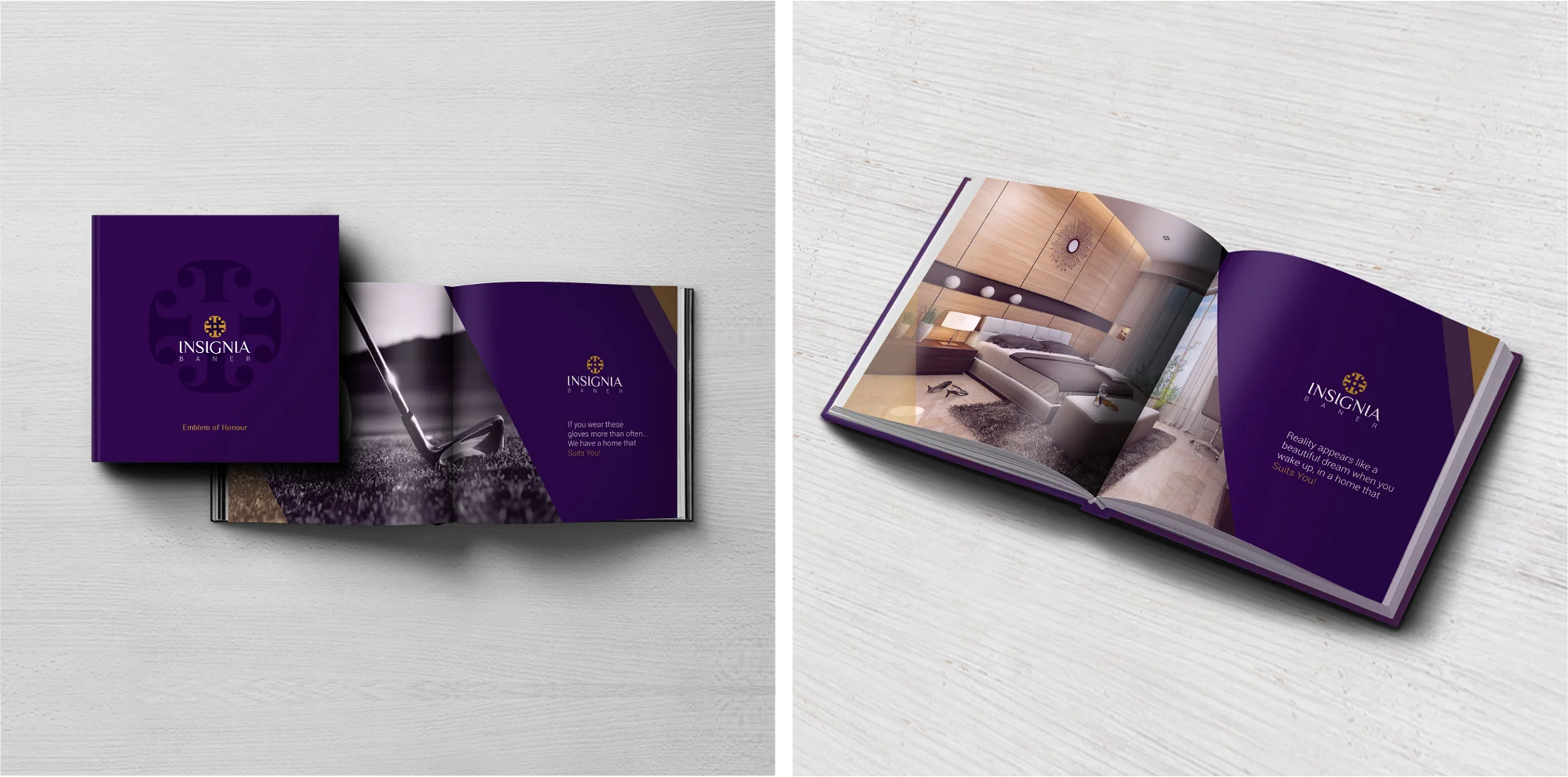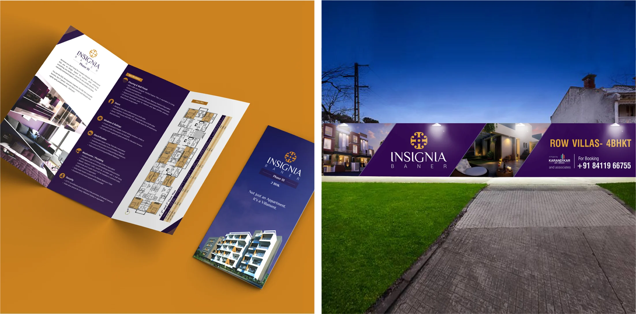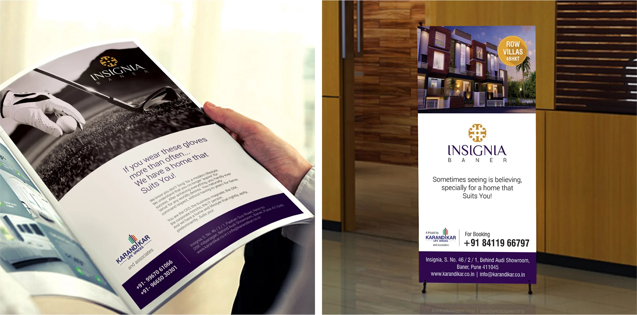 Insignia offers a premium lifestyle with modern amenities in Baner. All communication - brochures, hoardings, standees, site branding, and print ads was designed to highlight its elite appeal, using visually driven creatives to reflect sophistication, aspiration, and a high-class living experience.