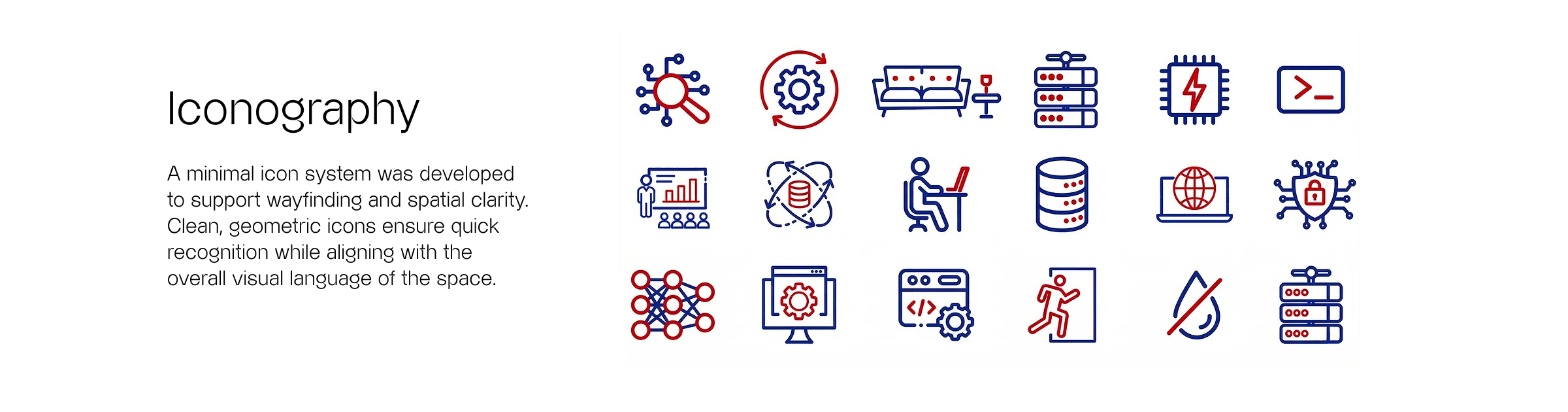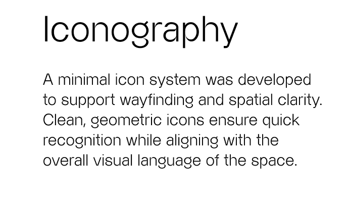 A clear and intuitive wayfinding system was designed to simplify navigation across the building. Minimal signage and iconography ensure ease of movement while maintaining visual consistency.
