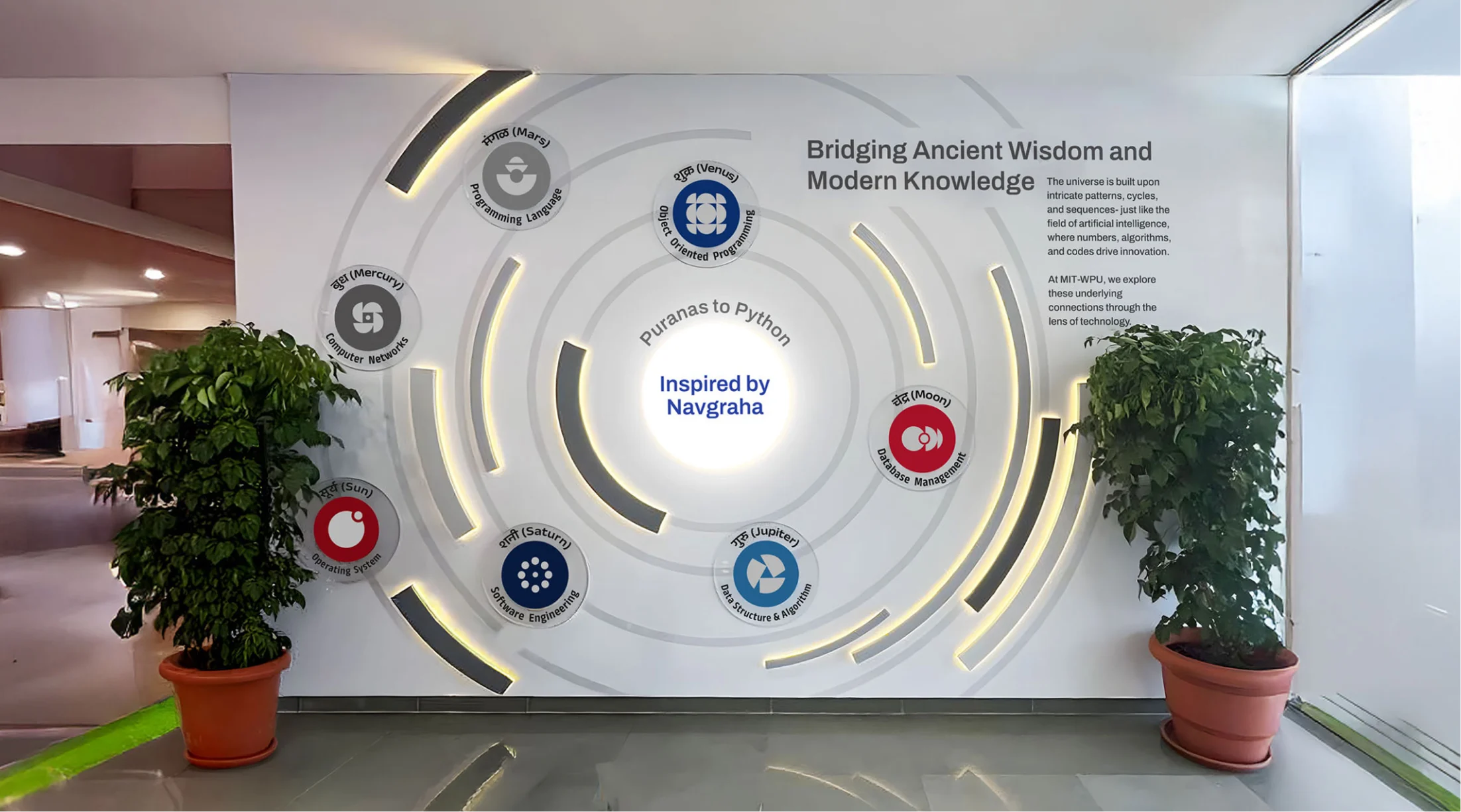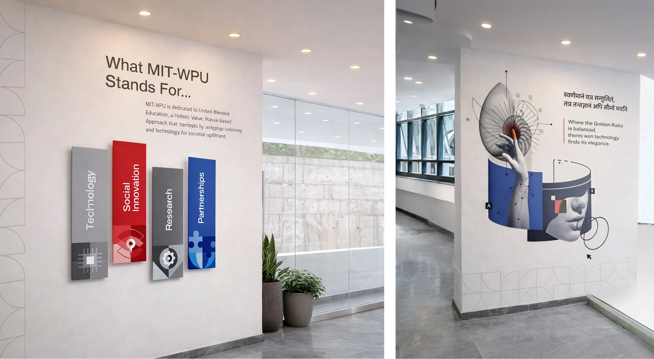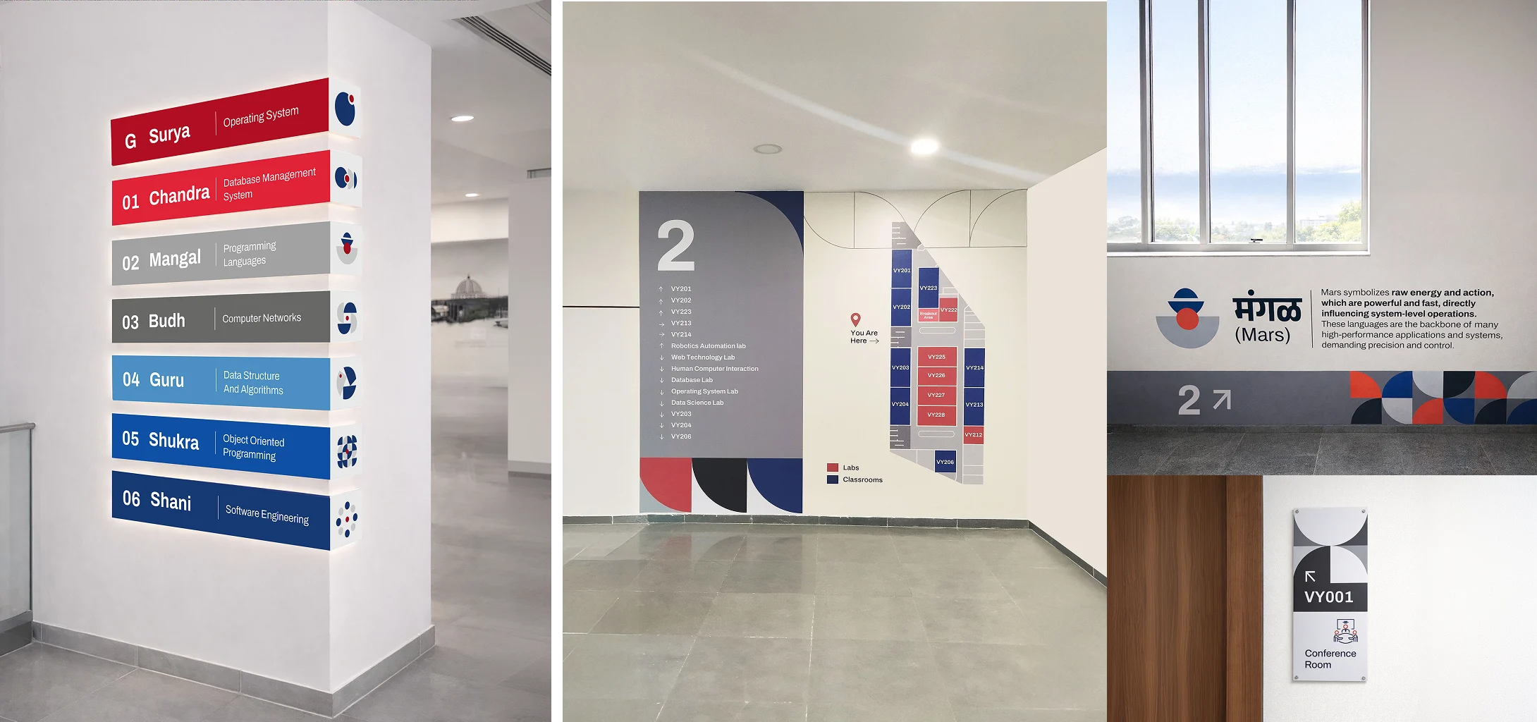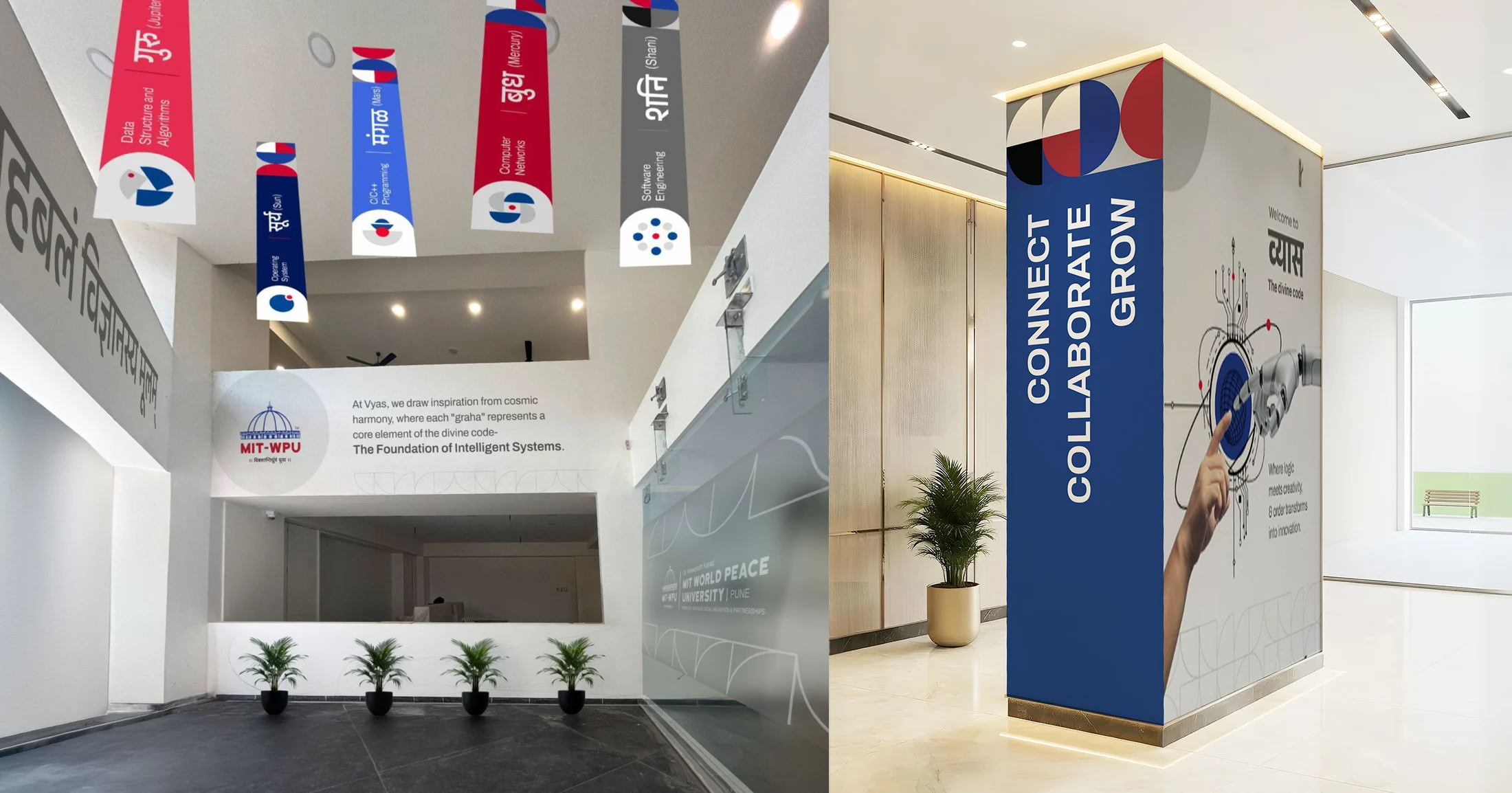 The Vyas Building at MIT-WPU houses the School of Computer Science and Engineering along with the Institute of Artificial Intelligence. It is a space dedicated to disciplines such as Artificial Intelligence, Data Science, Robotics, Software Engineering, and advanced computing technologies. The objective of the project was to develop an internal branding system that transforms the building into a cohesive and engaging environment- one that reflects the spirit of technological innovation while improving spatial navigation and visual identity across the building.