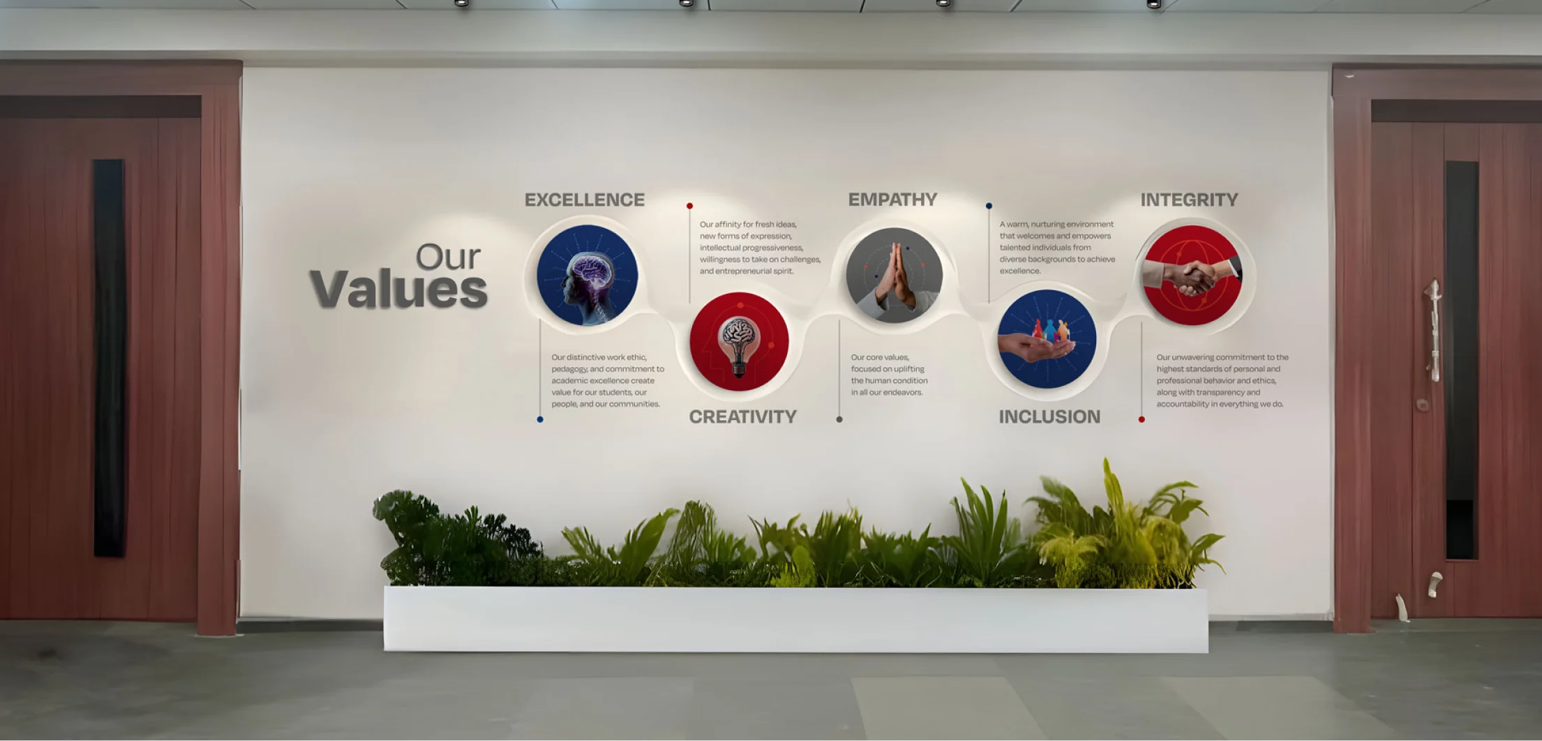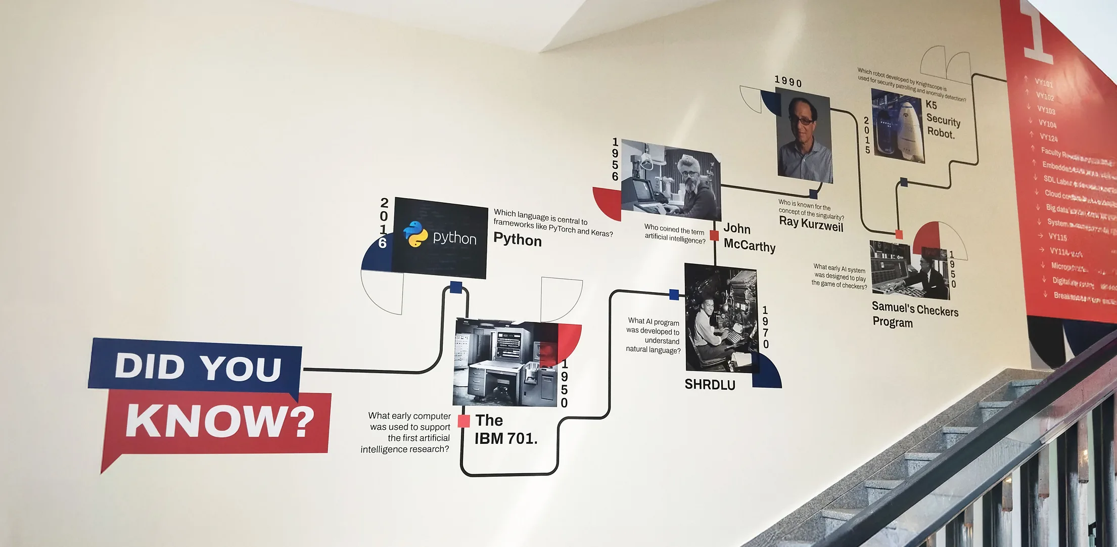 Environmental graphics are integrated across key spaces, creating a cohesive visual narrative. Each area reflects core disciplines and the overall concept.