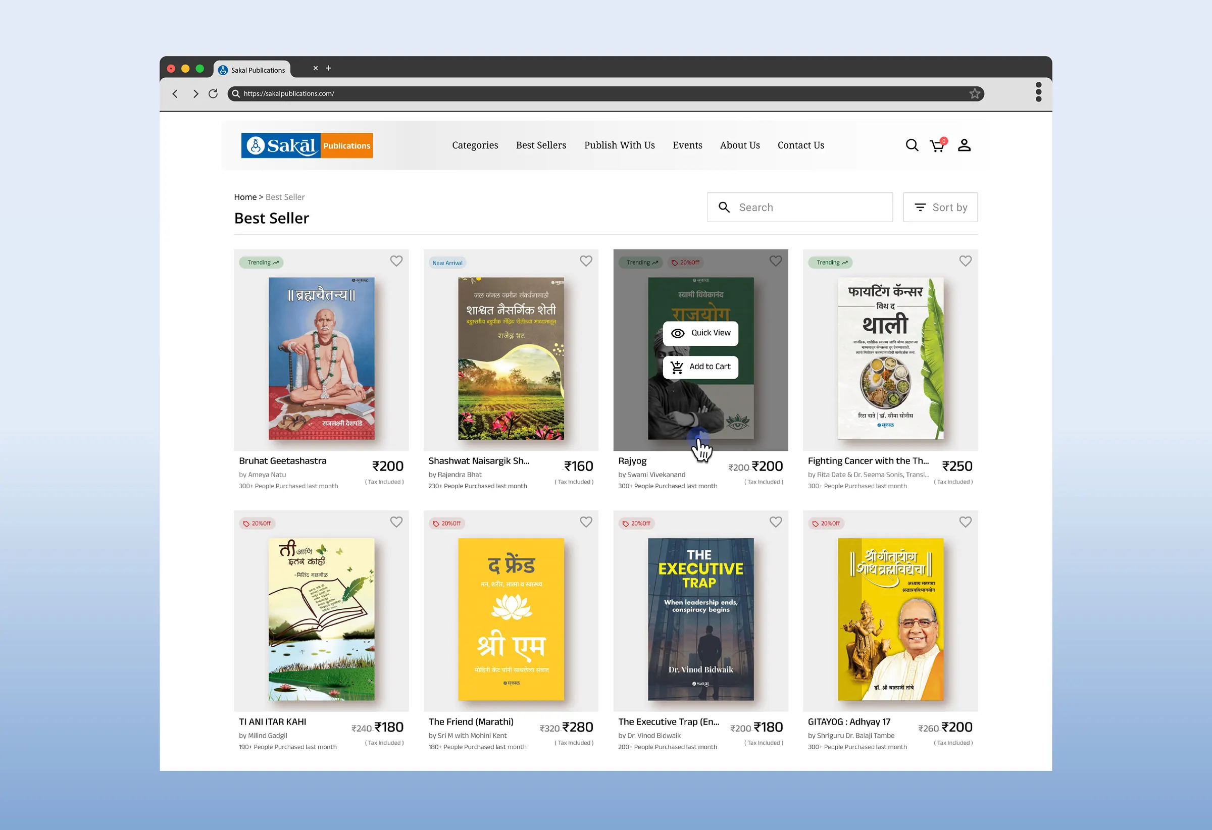 We reimagined Sakal Publications as a modern, user-centric platform while respecting its legacy. Our focus was to simplify navigation, structure diverse content, and enhance discoverability. We aimed to create a seamless browsing and buying experience across devices, ensuring readers can effortlessly explore books and engage with the brand’s rich knowledge ecosystem.
