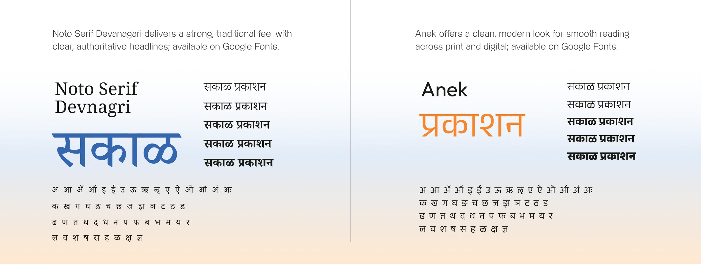 Typography at Sakal ensures clarity and credibility. We use Marathi and English fonts, including Noto Serif Devanagari for headlines, maintaining readability across platforms while reinforcing a consistent, trusted brand identity.