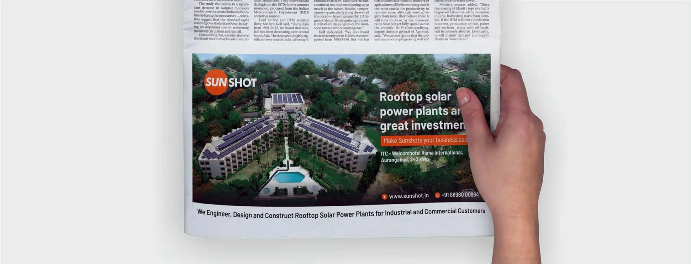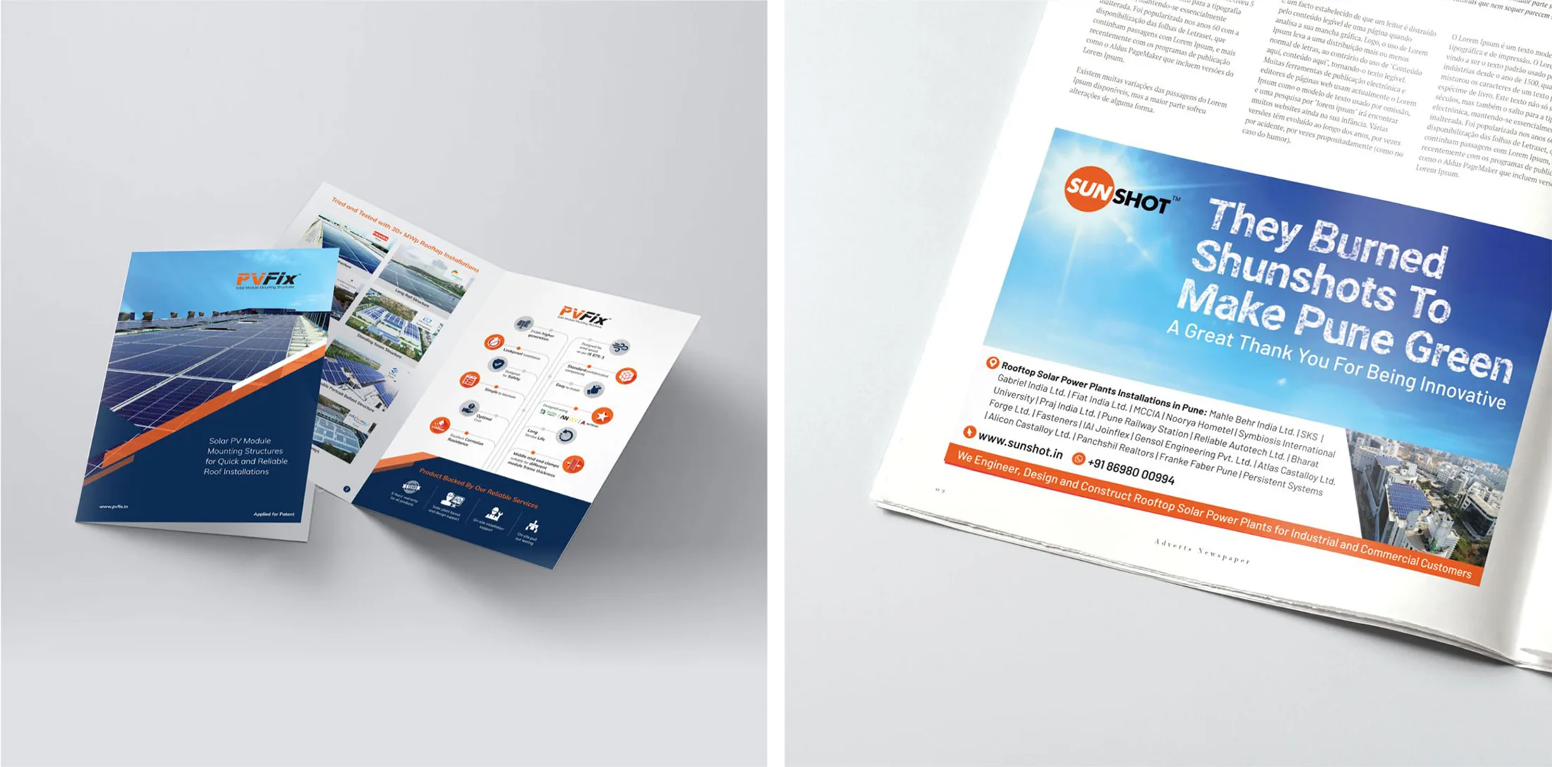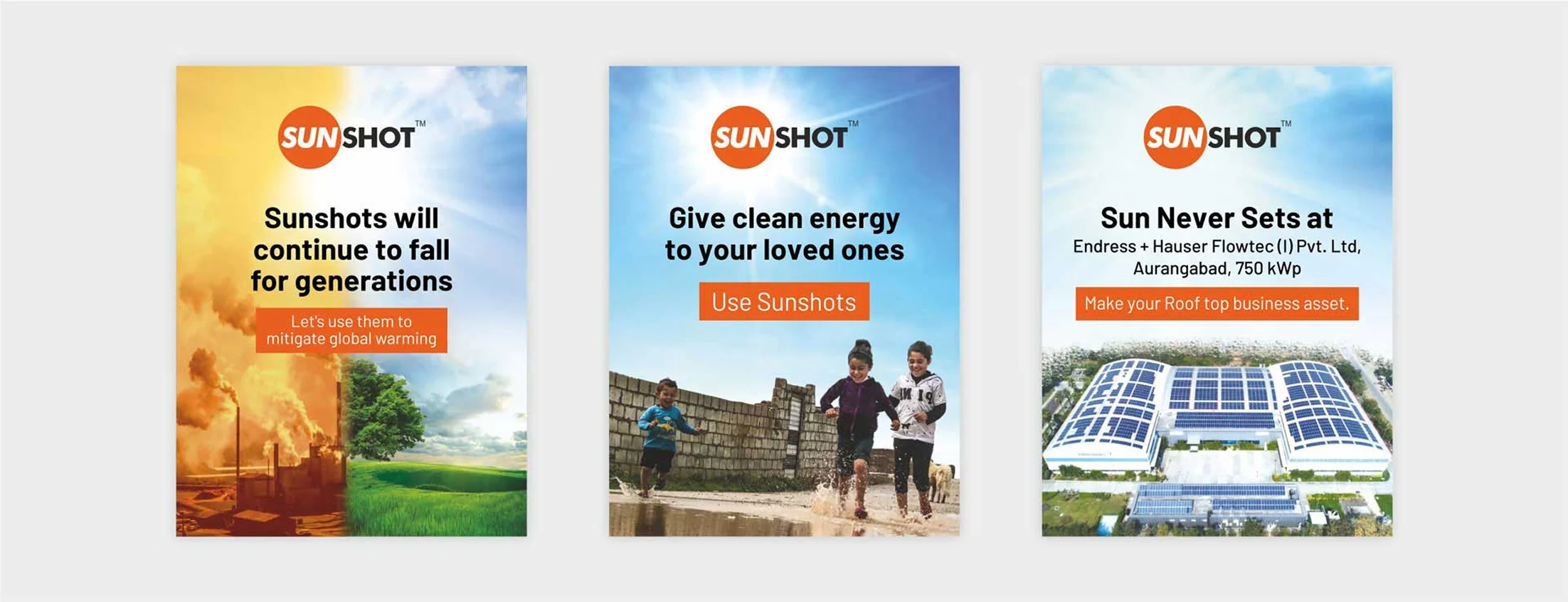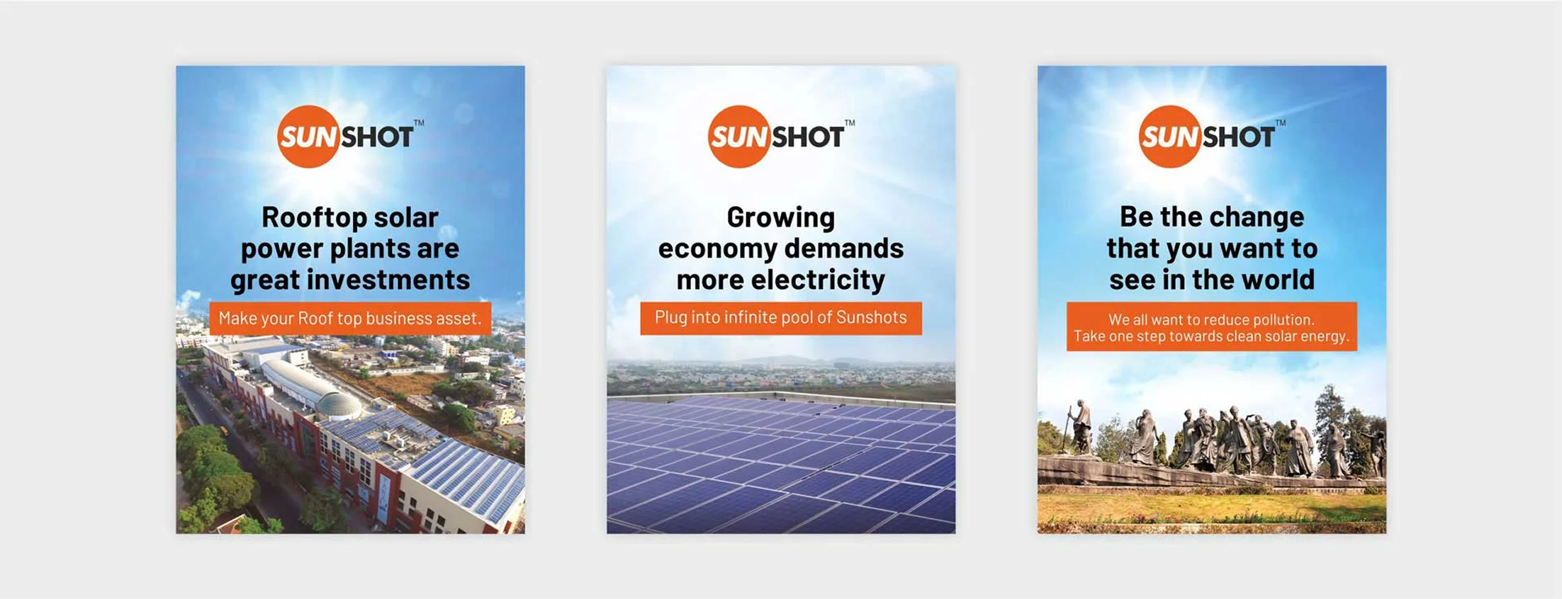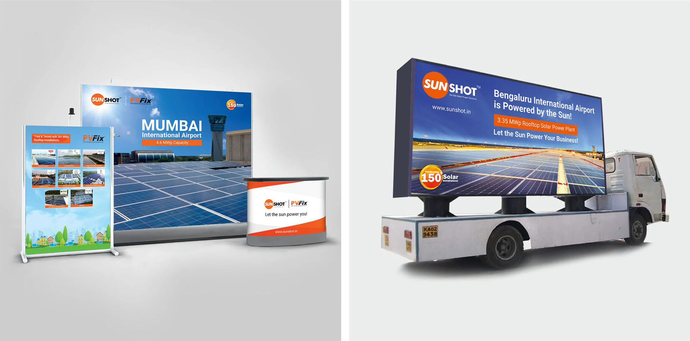 Sunshot’s communication positioned solar rooftops as a valuable business investment through a targeted Economic Times ad, mobile van branding, and exhibition collaterals like backdrops, brochures, podiums, and standees - enhancing visibility, credibility, and awareness among key enterprise decision-makers.