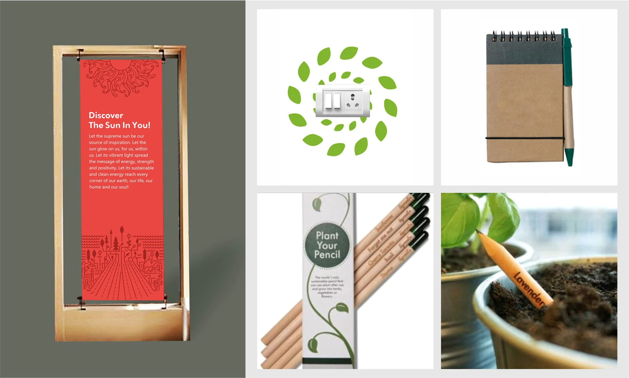 Suggested sustainable merchandise like plantable pens and pencils, recyclable notepads, energy-saving switchboard reminders, and standees showcasing the Sun and Pancha Mahabhuta to promote awareness.