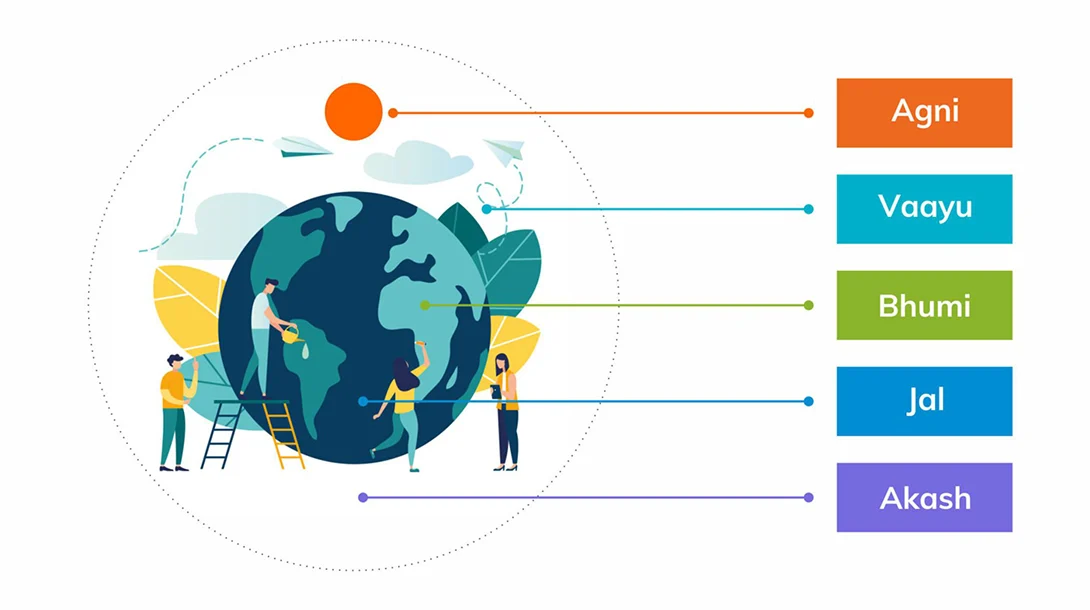 Solar energy supports a sustainable lifestyle by reducing dependence on limited resources. The sun powers all life, aligned with the concept of Pancha Mahabhuta-five elements: Agni (fire), Jal (water), Vaayu (air), Akash (space), and Bhumi (earth).